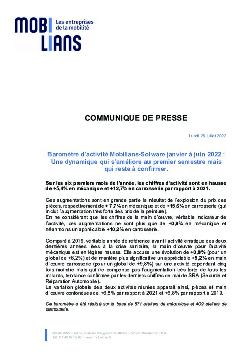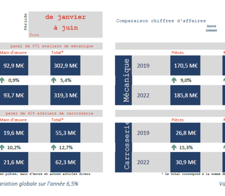 Sur les six premiers mois de l’année, les chiffres d’activité sont en hausse de +5,4% en mécanique et +12,7% en carrosserie par rapport à 2021. Ces augmentations sont en grande partie le résultat de l’explosion du prix des pièces, respectivement de + 7,7% en mécanique et de +15,6% en carrosserie (qui inclut l’augmentation très forte des prix de la peinture).