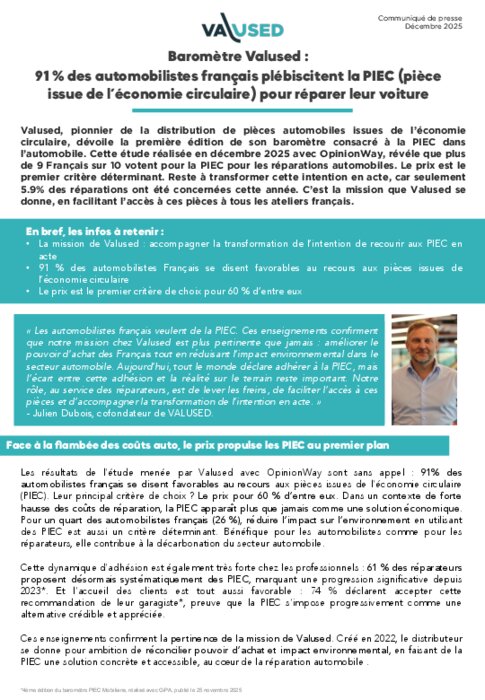 Valused, pionnier de la distribution de pièces automobiles issues de l’économie circulaire, dévoile la première édition de son baromètre consacré à la PIEC dans l’automobile. Cette étude réalisée en décembre 2025 avec OpinionWay, révéleque plus de 9 Français sur 10 votent pour la PIEC pour les réparations automobiles. Le prix est le premier critère déterminant. Reste à transformer cette intention en acte, car seulement 5.9% des réparations ont été concernées cette année. C’est la mission que Valusedse donne, en facilitant l’accès à ces pièces à tous les ateliers français.