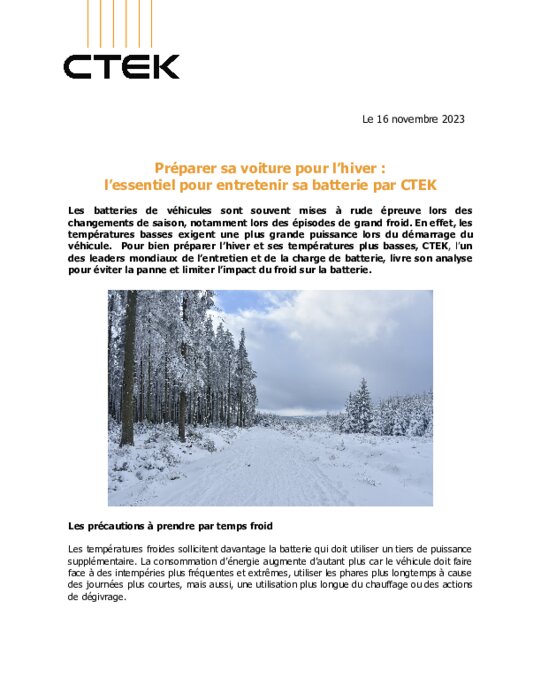 Equipementiers 16 novembre 2023 - 10:17 Pour bien préparer l’hiver et ses températures plus basses, CTEK, l’un des leaders mondiaux de l’entretien et de la charge de batterie, livre son analyse pour éviter la panne et limiter l’impact du froid sur la batterie. PDF (529 Ko) Télécharger