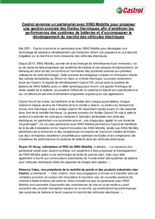 Castrol vient d’annoncer un partenariat avec XING Mobility pour développer une technologie de batterie à refroidissement par immersion offrant une puissance et une sécurité inégalées sur le marché en forte croissance des véhicules électriques.