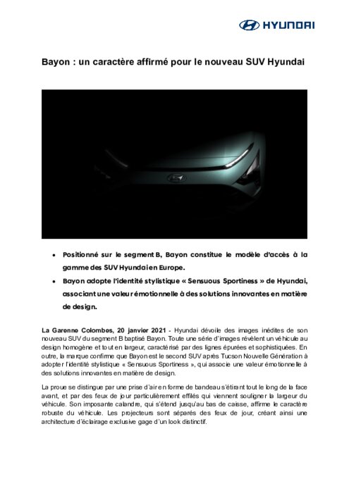 Hyundai dévoile des images inédites de son nouveau SUV du segment B baptisé Bayon. Toute une série d’images révèlent un véhicule au design homogène et tout en largeur, caractérisé par des lignes épurées et sophistiquées. En outre, la marque confirme que Bayon est le second SUV après Tucson Nouvelle Génération à adopter l’identité stylistique " Sensuous Sportiness ", qui associe une valeur émotionnelle à des solutions innovantes en matière de design.