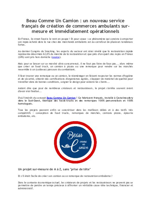 Il faut trouver une remorque ou un camion, le réaménager en faisant respecter les normes d'hygiène et de sécurité, obtenir des certifications d'organismes agréés, s'équiper de matériel de qualité pour travailler dans de bonnes conditions, soigner le design pour séduire les clients... D'où l'intérêt du concept Beau Comme Un Camion ! Ce fabricant français, installé à Castelnaudary dans le Sud-Ouest, fabrique des foods-trucks et des remorques 100% personnalisés et 100% homologués.