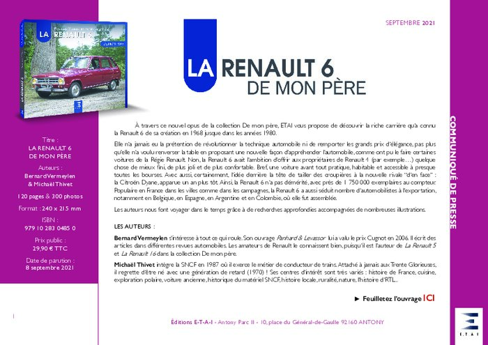 À travers ce nouvel opus de la collection De mon père, ETAI vous propose de découvrir la riche carrière qu’a connu la Renault 6 de sa création en 1968 jusque dans les années 1980. Elle n’a jamais eu la prétention de révolutionner la technique automobile ni de remporter les grands prix d’élégance, pas plus qu’elle n’a voulu renverser la table en proposant une nouvelle façon d’appréhender l’automobile, comme ont pu le faire certaines voitures de la Régie Renault.