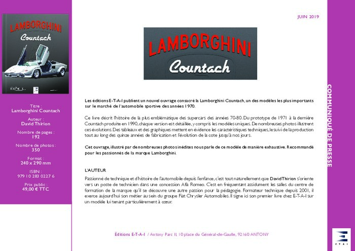 Constructeurs 29 mai 2019 - 10:11 Les éditions E-T-A-I publient un nouvel ouvrage consacré à la Lamborghini Countach, un des modèles les plus importants sur le marché de l’automobile sportive des années 1970. PDF (592 Ko) Télécharger