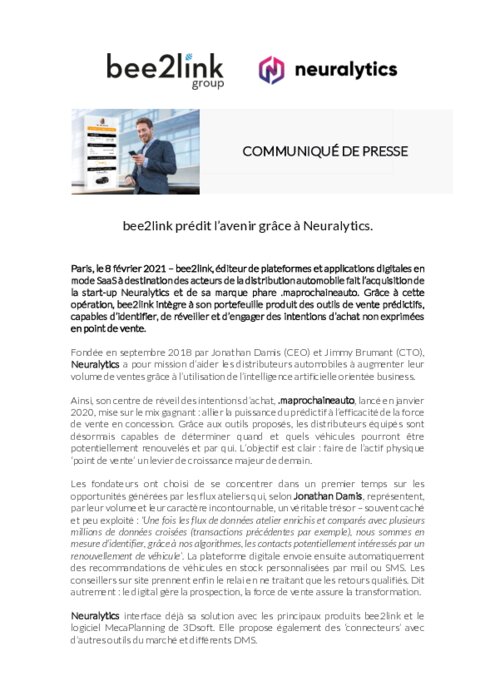 bee2link a fait l’acquisition de la start-up Neuralytics vendredi dernier. La mission de Neuralytics est d’aider les distributeurs automobiles à augmenter leur volume de ventes grâce à l’utilisation de l’intelligence artificielle. Par le biais de sa marque commerciale .maprochaineauto, Neuralytics propose aux concessionnaires des outils de vente prédictifs capables d’anticiper et de réveiller les intentions d’achat en point de vente...