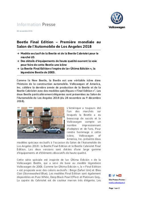 Comme la New Beetle, la Beetle est une véritable icône dans l’histoire de la construction automobile. Volkswagen of America célèbre la dernière année de production de la Beetle et de la Beetle Cabriolet avec des modèles spécifiques " Final Edition ". Les deux Beetle particulièrement élégantes sont présentées au Salon de l'Automobile de Los Angeles 2018 (du 28 novembre au 9 décembre 2018).