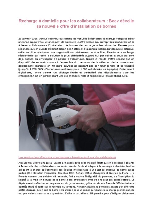 Acteur reconnu du leasing de voitures électriques, la startup française Beev annonce aujourd’hui le lancement de sa nouvelle offre dédiée aux entreprises souhaitant offrir à leurs collaborateurs l’installation de bornes de recharge à leur domicile. Pensée pour répondre aux enjeux de l’électrification des flottes et à la généralisation du véhicule électrique, cette solution s’adresse aux organisations désireuses de simplifier l’accès à la recharge résidentielle qui reste la solution la plus plébiscitée aujourd’hui par celles et ceux qui sont déjà passés ou envisagent de passer à l’électrique.