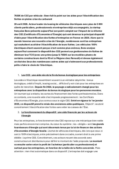 Acteur leader du leasing de véhicules électriques avec plus de 5 000 clients particuliers, professionnels et entreprises déjà accompagnés, la startup française Beev présente aujourd’hui son point complet sur l’impact de la réforme des CEE (Certificats d’Économies d’Énergie) qui sont devenus le principal dispositif d’aide pour l’électrification des flottes d’entreprise en France en 2026.