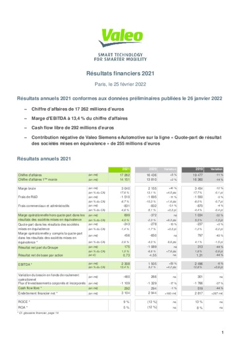 Dès 2022, Valeo vise une forte hausse de son chiffre d'affaires, entre 19,2 et 20 milliards d'euros, et une marge d'Ebitda (excédent brut d'exploitation) entre 11,8 et 12,3%.