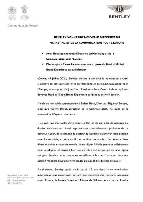 Bentley Motors a annoncé la nomination d'Amel Boubaaya en tant que Directrice du Marketing et de la Communication pour l'Europe, à compter d'aujourd'hui. Amel remplace Caren Jochner qui est devenue Head of Global Brand Expérience de Bentley en Avril dernier.