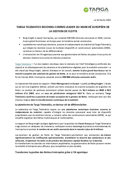 Targa Telematics, l’un des leaders mondiaux de l’AIoT (intelligence artificielle des objets) et du développement de solutions et plateformes digitales dédiées à la mobilité connectée, a été désigné par le cabinet d’analyse et de conseil Berg Insight comme le premier fournisseur sur le marché européen des solutions de gestion de flotte, et ce pour la troisième année consécutive. À la fin de l’année 2024, l’entreprise totalisait environ 900 000 véhicules connectés actifs.