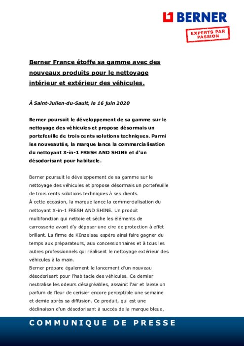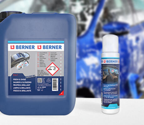 Berner poursuit le développement de sa gamme sur le nettoyage des véhicules et propose désormais un portefeuille de trois cents solutions techniques. Parmi les nouveautés, la marque lance la commercialisation du nettoyant X-in-1 FRESH AND SHINE et d’un désodorisant pour habitacle.