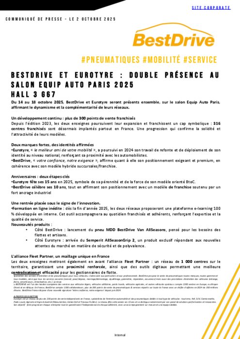 Du 14 au 18 octobre, BestDrive et Eurotyre seront présents ensemble, sur le salon Equip Auto Paris, affirmant le dynamisme et la complémentarité de leurs réseaux.