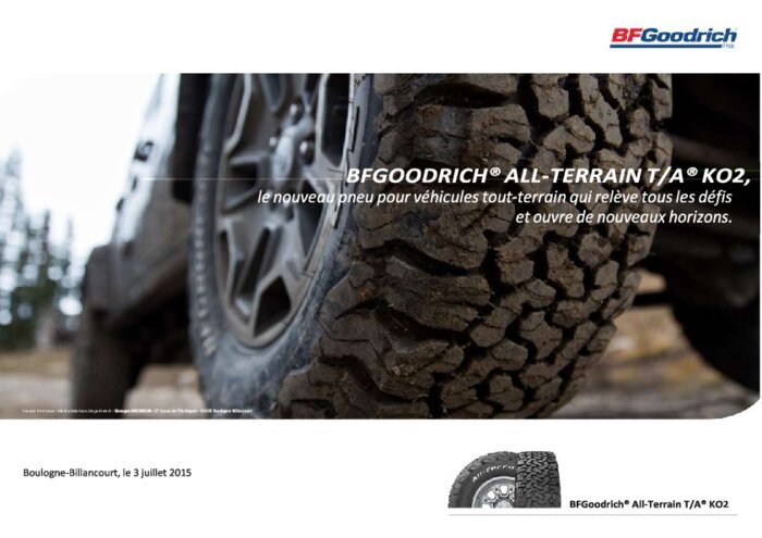 Commercialisé en Europe dès les premiers jours de l’été 2015, le nouveau pneu BFGoodrich All-Terrain T/A KO2 offre une exceptionnelle robustesse, associée à d’excellentes performances de motricité, de longévité et d’adhérence, lui permettant d’affronter les conditions de roulage et de franchissement les plus difficiles, notamment sur asphalte, sur routes empierrées, sur terre, sur pistes, dans la boue ou dans la neige.