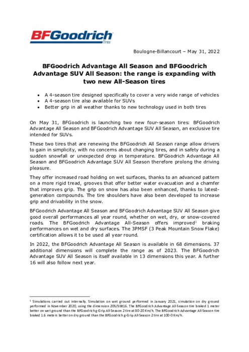 BFGoodrich lance deux nouveaux pneus quatre saisons. Les nouveaux pneus viennent renouveler la gamme BFGoodrich All Season, permettant aux automobilistes de gagner en simplicité, sans souci de changement de pneus, et en sécurité lors d'une chute de neige soudaine ou d'une baisse de température inattendue. Les pneus BFGoodrich Advantage prolongent ainsi le plaisir de conduire.