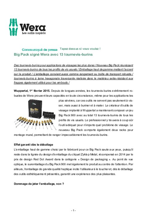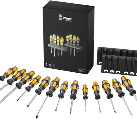 Des tournevis-burins pour applications de vissages les plus dures / Nouveau Big Pack réunissant 13 tournevis-burins de tous les profils de vis usuels / Emballage haut de gamme mettant l’accent sur le produit / L’emballage convient aussi comme rangement ou boîte de transport robuste / tournevis-burins à lame hexagonale traversante réalisée dans le matériau extra-résistant aux frappes également utilisé pour les embouts /