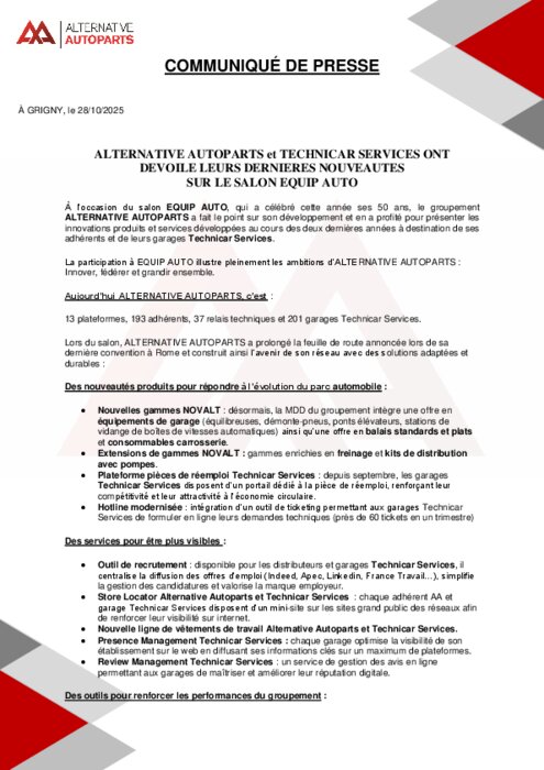 À l’occasion du salon EQUIP AUTO, qui a célébré cette année ses 50 ans, le groupement ALTERNATIVE AUTOPARTS a fait le point sur son développement et en a profité pour présenter les innovations produits et services développées au cours des deux dernières années à destination de ses adhérents et de leurs garages Technicar Services.