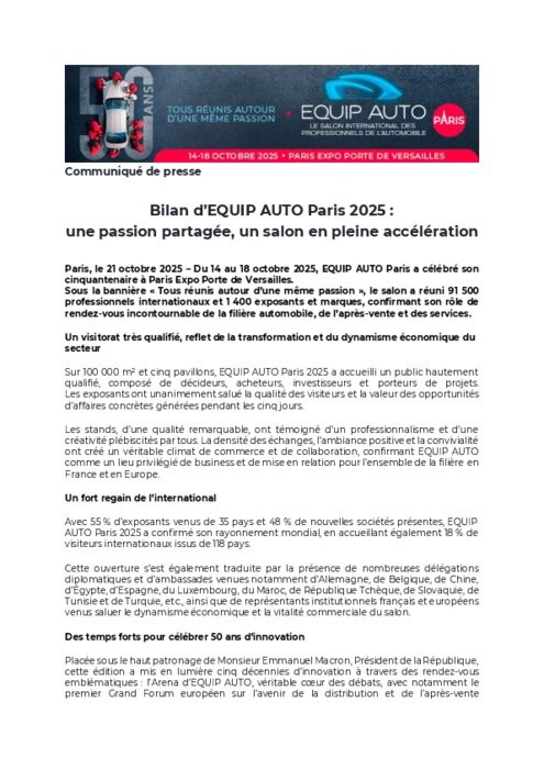 Du 14 au 18 octobre 2025, EQUIP AUTO Paris a célébré son cinquantenaire à Paris Expo Porte de Versailles. Sous la bannière « Tous réunis autour d’une même passion », le salon a réuni 91 500 professionnels internationaux et 1 400 exposants et marques, confirmant son rôle de rendez-vous incontournable de la filière automobile, de l’après-vente et des services.