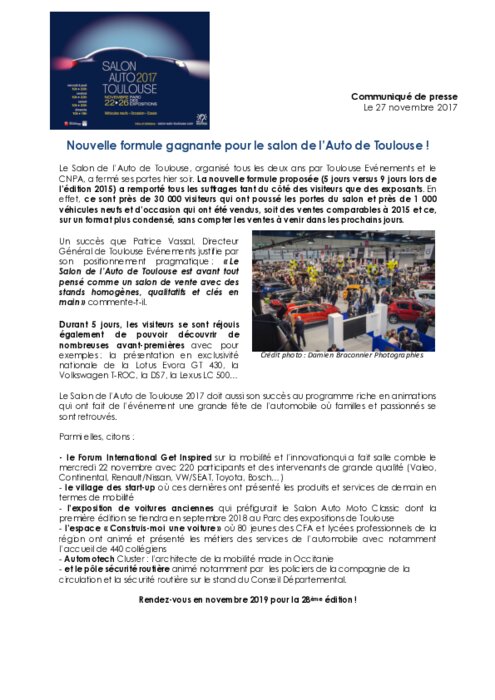 Le Salon de l'Auto de Toulouse, organisé tous les deux ans par Toulouse Evénements et le CNPA, a fermé ses portes dimanche soir. La nouvelle formule proposée (5 jours versus 9 jours lors de l'édition 2015) a remporté tous les suffrages tant du côté des visiteurs que des exposants. En effet, ce sont près de 30 000 visiteurs qui ont poussé les portes du salon et près de 1 000 véhicules neufs et d'occasion qui ont été vendus, soit des ventes comparables à 2015 et ce, sur un format plus condensé...