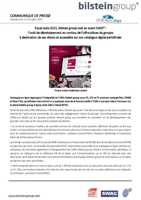 Catalogue en ligne regroupant l’intégralité de l’offre bilstein group pour VL, VUL et PL sous ses marques febi, SWAG et Blue Print, partsfinder s’est enrichi il y a quelques mois de la fonctionnalité « FANS » qui sera mise à l’honneur sur le stand bilstein group à Equip Auto (Hall 1 Stand K070).