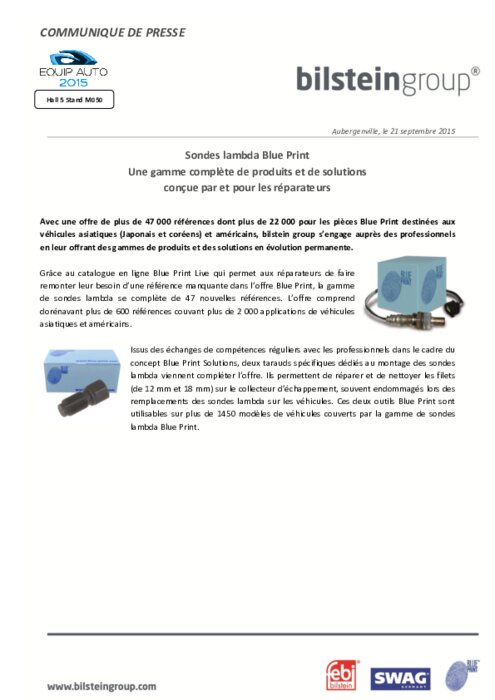Avec une offre de plus de 47 000 références dont plus de 22 000 pour les pièces Blue Print destinées aux véhicules asiatiques (Japonais et coréens) et américains, bilstein group s’engage auprès des professionnels en leur offrant des gammes de produits et des solutions en évolution permanente.