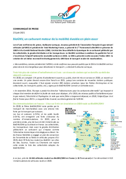 Lors d’une conférence de presse, Guillaume Larroque, nouveau président de l’Association française du gaz naturel véhicules (AFGNV) et président de Total Marketing France, a présenté le 1er Panorama du BioGNV en présence de GRDF et du Comité National Routier (CNR). Cet état des lieux détaille la dynamique de ce carburant plébiscité par les collectivités, la grande distribution et les transporteurs. Le BioGNV contribue à améliorer la qualité de l’air...