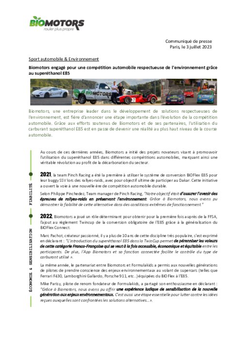 Biomotors, une entreprise leader dans le développement de solutions respectueuses de l'environnement, est fière d'annoncer une étape importante dans l'évolution de la compétition automobile. Grâce aux efforts soutenus de Biomotors et de ses partenaires, l'utilisation du carburant superéthanol E85 est en passe de devenir une réalité au plus haut niveau de la course automobile.