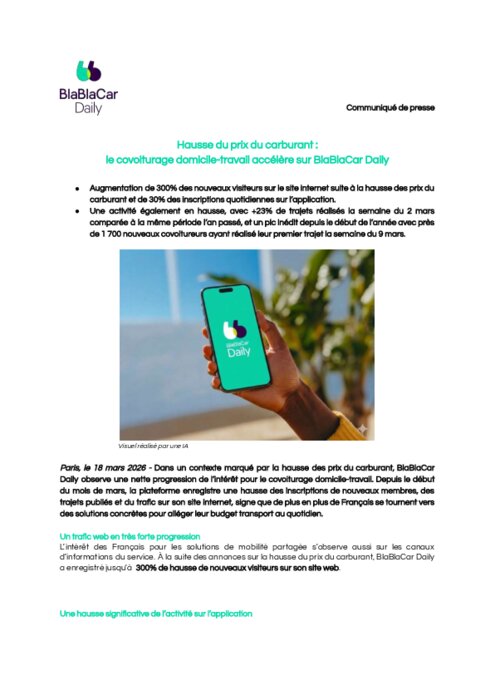 Dans un contexte marqué par la hausse des prix du carburant, BlaBlaCar Daily observe une nette progression de l’intérêt pour le covoiturage domicile-travail. Depuis le début du mois de mars, la plateforme enregistre une hausse des inscriptions de nouveaux membres, des trajets publiés et du trafic sur son site internet, signe que de plus en plus de Français se tournent vers des solutions concrètes pour alléger leur budget transport au quotidien.
