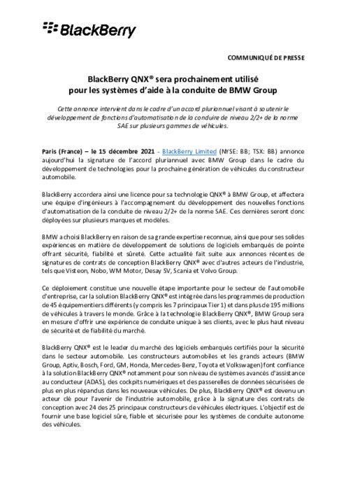 BlackBerry Limited annonce la signature de l’accord pluriannuel avec BMW Group dans le cadre du développement de technologies pour la prochaine génération de véhicules du constructeur automobile. BlackBerry accordera ainsi une licence pour sa technologie QNX à BMW Group, et affectera une équipe d'ingénieurs à l’accompagnement du développement des nouvelles fonctions d'automatisation de la conduite de niveau 2/2+ de la norme SAE. Ces dernières seront déployées sur plusieurs marques et modèle...