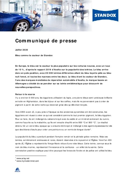 En Europe, le bleu est la couleur la plus populaire sur les voitures neuves, avec un taux de 10 %, d’après le rapport 2019 d’Axalta sur la popularité des teintes. Le bleu arrive donc en pole position, avec 20 000 teintes différentes allant du bleu layette pâle au bleu nuit foncé, et toutes les nuances entre les deux. Le bleu étant la couleur de Standox, l'une des marques mondiales de réparation automobile d'Axalta, la marque basée en Allemagne a décidé de se pencher sur sa teinte emblématique...