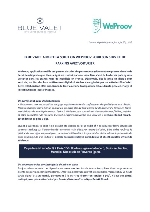 WeProov, application mobile qui permet de créer simplement et rapidement une preuve visuelle de l'état de n'importe quel bien, a signé un contrat national avec Blue Valet, le leader du parking avec voiturier dans les grands hubs de mobilités en France. Désormais, dès la prise en charge d'un véhicule, un état des lieux entièrement digitalisé WeProov est généré par un voiturier Blue Valet.