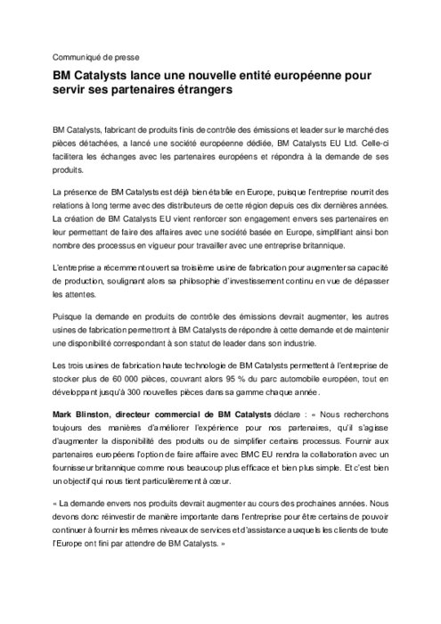 BM Catalysts, fabricant de produits finis de contrôle des émissions et leader sur le marché des pièces détachées, a lancé une société européenne dédiée, BM Catalysts EU Ltd. Celle-ci facilitera les échanges avec les partenaires européens et répondra à la demande de ses produits.