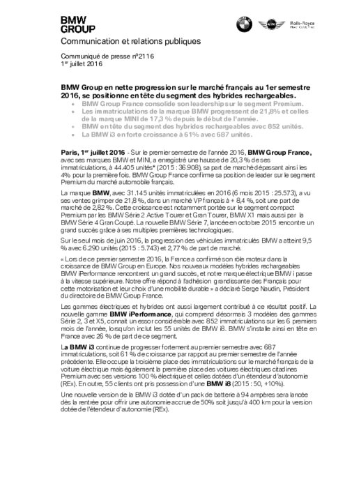 BMW consolide son leadership sur le segment Premium. Les immatriculations de la marque BMW progressent de 21,8% et celles de la marque MINI de 17,3 % depuis le début de l’année. BMW en tête du segment des hybrides rechargeables avec 852 unités. La BMW i3 en forte croissance à 61% avec 687 unités.