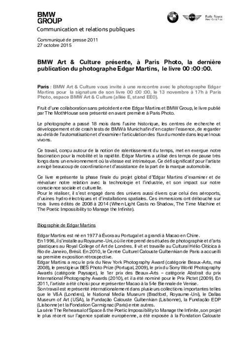 BMW Art & Culture vous invite à une rencontre avec le photographe Edgar Martins pour la signature de son livre 00 :00 :00, le 13 novembre à 17h à Paris Photo, espace BMW Art & Culture (allée E, stand EE0). Fruit d’une collaboration sans précédent entre Edgar Martins et BMW Group, le livre publié par The MothHouse sera présenté en avant première à Paris Photo.