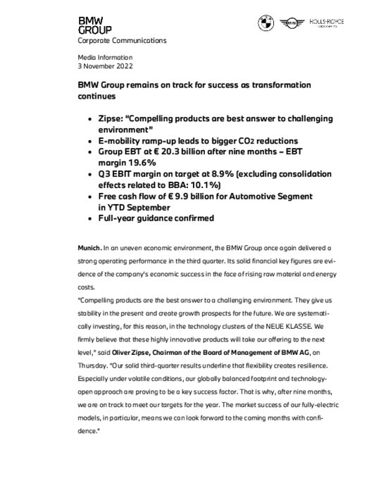 "Au cours des neuf premiers mois de l'année, et en particulier au troisième trimestre, la hausse des coûts des matériaux et de la logistique" a eu un "impact" sur l'EBIT de la branche automobile, explique BMW, qui parvient tout de même à dégager un résultat d'exploitation de 2,87 milliards d'euros sur ce segment (+63,6%).