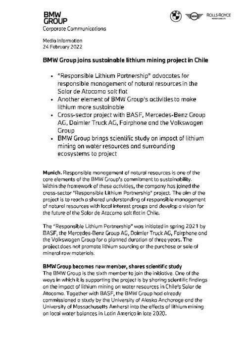 La gestion responsable des ressources naturelles est l'un des éléments fondamentaux de l'engagement du BMW Group en faveur du développement durable. Dans le cadre de ces activités, l'entreprise a rejoint le projet intersectoriel "Responsible Lithium Partnership". L'objectif de ce projet est de parvenir à une compréhension commune de la gestion responsable des ressources naturelles avec les groupes d'intérêt locaux et de développer une vision pour l'avenir du salar d'Atacama au Chili.