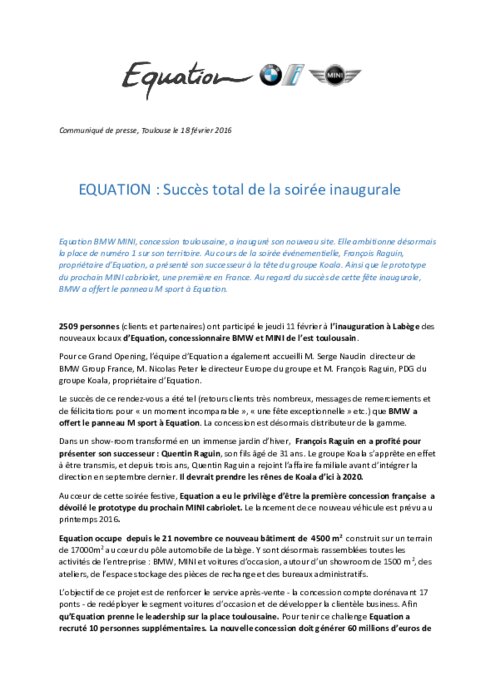 Equation BMW MINI, concession toulousaine, a inauguré son nouveau site. Elle ambitionne désormais la place de numéro 1 sur son territoire. Au cours de la soirée événementielle, François Raguin, propriétaire d’Equation, a présenté son successeur à la tête du groupe Koala. Ainsi que le prototype du prochain MINI cabriolet, une première en France. Au regard du succès de cette fête inaugurale, BMW a offert le panneau M sport à Equation.