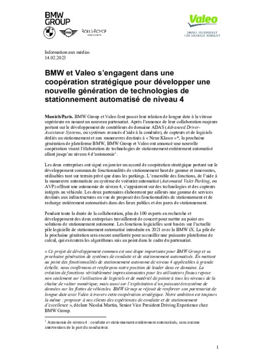 BMW Group et Valeo font passer leur relation de longue date à la vitesse supérieure en nouant un nouveau partenariat. Après l’annonce de leur collaboration majeure portant sur le développement de contrôleurs de domaine ADAS (Advanced DriverAssistance Systems, ou systèmes avancés d’aide à la conduite), de capteurs et de logiciels dédiés au stationnement et aux manœuvres destinés à « Neue Klasse », la prochaine génération de plateforme BMW, BMW Group et Valeo ont annoncé une nouvelle coopération.