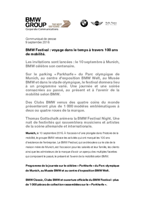 Les invitations sont lancées : le 10 septembre à Munich, BMW célèbre son centenaire. Sur le parking « Parkharfe » du Parc olympique de Munich, au centre d’exposition BMW Welt, au Musée BMW et dans le stade olympique, le festival donnera lieu à un programme varié. Une journée et une soirée consacrées au passé, au présent et à l’avenir de la mobilité selon BMW. Des Clubs BMW venus des quatre coins du monde présenteront plus de 1 000 modèles emblématiques à deux ou quatre roues de la marque.