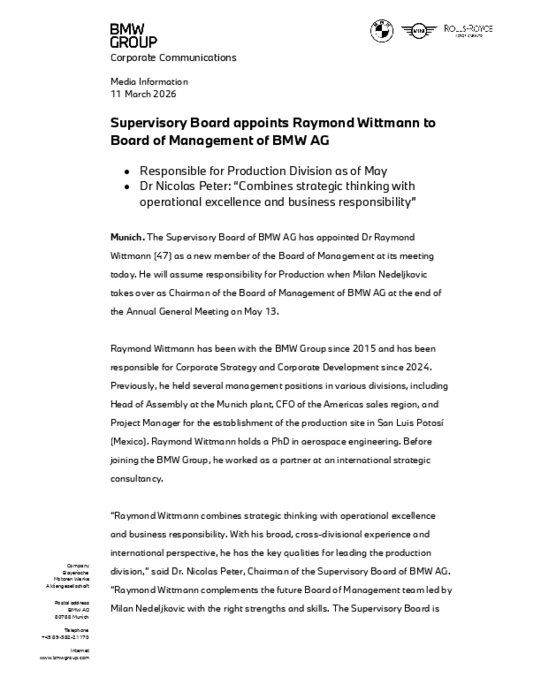 Le conseil de surveillance de BMW AG a nommé aujourd'hui Raymond Wittmann (47 ans) nouveau membre du directoire. Il assumera la responsabilité de la production lorsque Milan Nedeljkovic prendra la présidence du directoire de BMW AG à l'issue de l'assemblée générale annuelle du 13 mai.