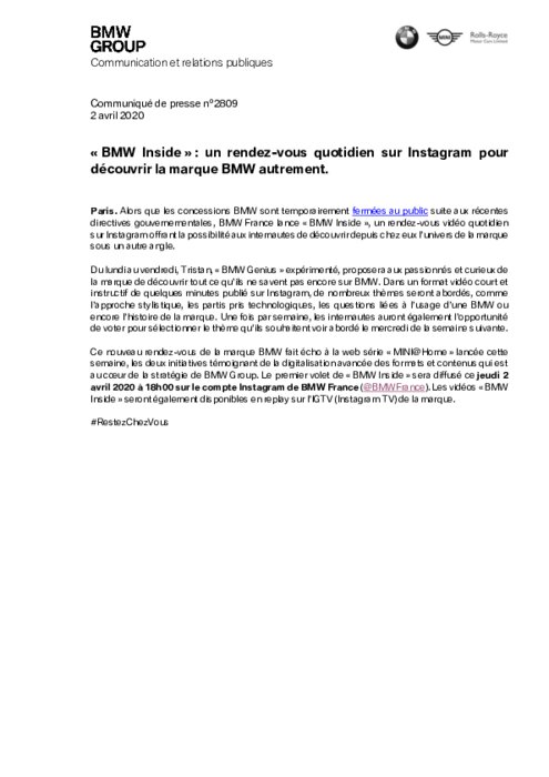 Alors que les concessions BMW sont temporairement fermées au public suite aux récentes directives gouvernementales, BMW France lance " BMW Inside" , un rendez-vous vidéo quotidien sur Instagram offrant la possibilité aux internautes de découvrir depuis chez eux l’univers de la marque sous un autre angle.