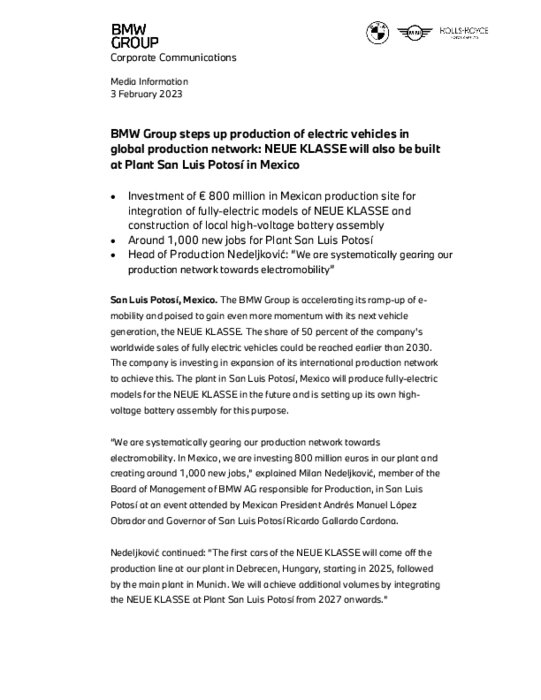 "Avec ce nouvel investissement, notre usine de San Luis Potosi jouera un rôle central dans la transition de BMW Group vers l'électromobilité", a déclaré Harald Gottsche, président de l'usine BMW de San Luis Potosi.