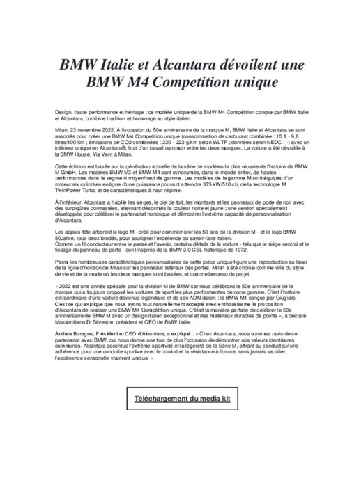 À l'occasion du 50e anniversaire de la marque M, BMW Italie et Alcantara se sont associés pour créer une BMW M4 Competition unique (consommation de carburant combinée : 10,1 - 9,8 litres/100 km ; émissions de CO2 combinées : 230 - 223 g/km selon WLTP ; données selon NEDC : -) avec un intérieur unique en Alcantara, fruit d'un travail commun entre les deux marques. La voiture a été dévoilée à