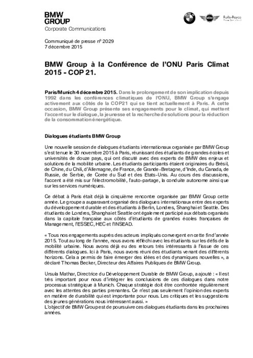 Dans le prolongement de son implication depuis 1992 dans les conférences climatiques de l’ONU, BMW Group s’engage activement aux côtés de la COP21 qui se tient actuellement à Paris. A cette occasion, BMW Group présente ses engagements pour le climat, qui mettent l’accent sur le dialogue, la jeunesse et la recherche de solutions pour la réduction de la consommation énergétique.