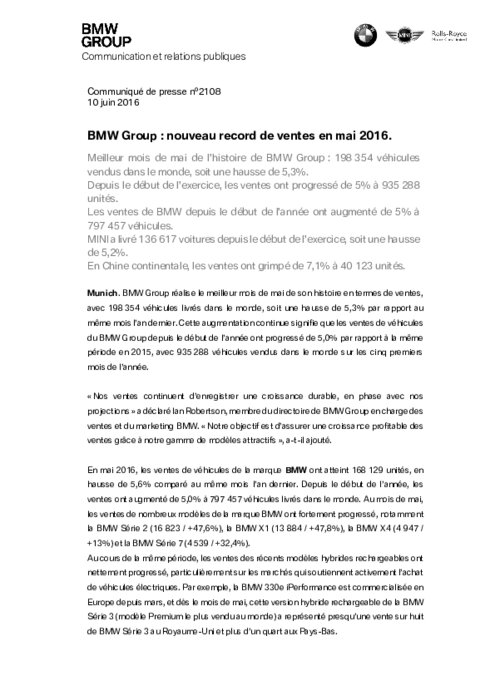 BMW réalise le meilleur mois de mai de son histoire en termes de ventes, avec 198 354 véhicules livrés dans le monde, soit une hausse de 5,3% par rapport au même mois l’an dernier. Cette augmentation continue signifie que les ventes de véhicules du BMW depuis le début de l’année ont progressé de 5,0% par rapport à la même période en 2015, avec 935 288 véhicules vendus dans le monde sur les cinq premiers mois de l’année.