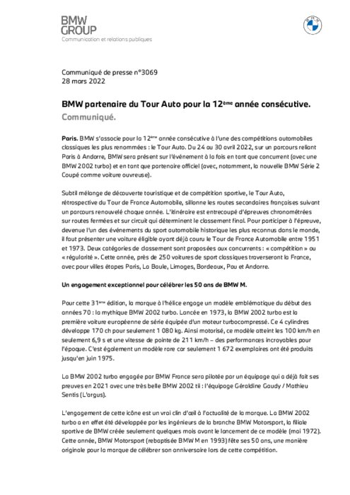 BMW s’associe pour la 12ème année consécutive à l’une des compétitions automobiles classiques les plus renommées : le Tour Auto. Du 24 au 30 avril 2022, sur un parcours reliant Paris à Andorre, BMW sera présent sur l’événement à la fois en tant que concurrent (avec une BMW 2002 turbo) et en tant que partenaire officiel (avec, notamment, la nouvelle BMW Série 2 Coupé comme voiture ouvreuse).