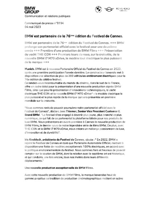 Ce rendez-vous incontournable du monde du cinéma, dans le sud de la France, offre un cadre idéal pour la présentation d'une nouvelle production signée BMW Films, ainsi que pour la présentation d'innovations technologiques, le yacht électrique THE ICON et la nouvelle BMW i7 M70 xDrive - le modèle électrique le plus puissant et le plus rapide de la marque qui sera présentée en première mondiale sur la croisette.