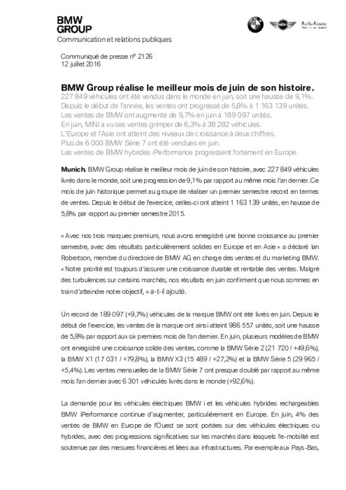 227 849 véhicules ont été vendus dans le monde en juin, soit une hausse de 9,1%. Depuis le début de l’année, les ventes ont progressé de 5,8% à 1 163 139 unités. Les ventes de BMW ont augmenté de 9,7% en juin à 189 097 unités. En juin, MINI a vu ses ventes grimper de 6,3% à 38 282 véhicules. L’Europe et l’Asie ont atteint des niveaux de croissance à deux chiffres. Plus de 6 000 BMW Série 7 ont été vendues en juin. Les ventes de BMW hybrides iPerformance progressent fortement en Europe.