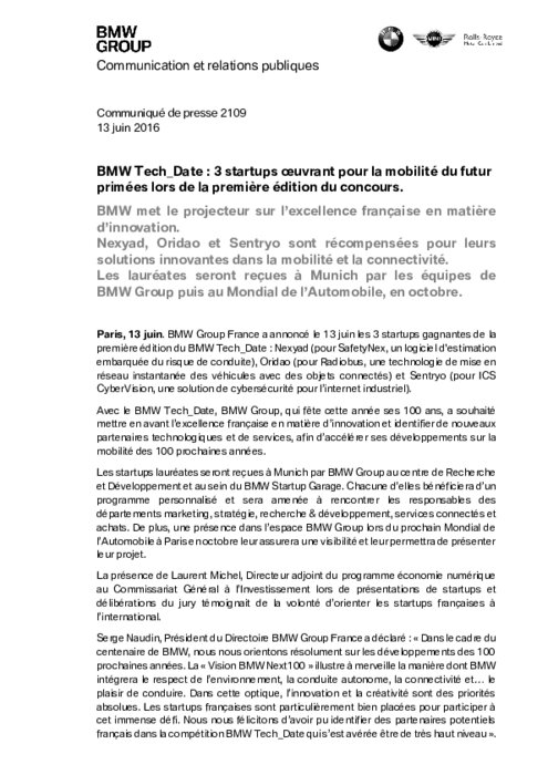 BMW France a annoncé le 13 juin les 3 startups gagnantes de la première édition du BMW Tech_Date : Nexyad (pour SafetyNex, un logiciel d'estimation embarquée du risque de conduite), Oridao (pour Radiobus, une technologie de mise en réseau instantanée des véhicules avec des objets connectés) et Sentryo (pour ICS CyberVision, une solution de cybersécurité pour l’internet industriel).