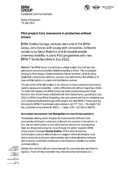 BMW Startup Garage, unité de capital-risque du BMW Group, s'associe à de jeunes entreprises de la Tech. Les solutions logicielles de Seoul Robotics et Embotech permettent une mobilité sans conducteur dans les usines. Programme pilote avec la nouvelle BMW Série 7 sera lancé en juillet 2022.